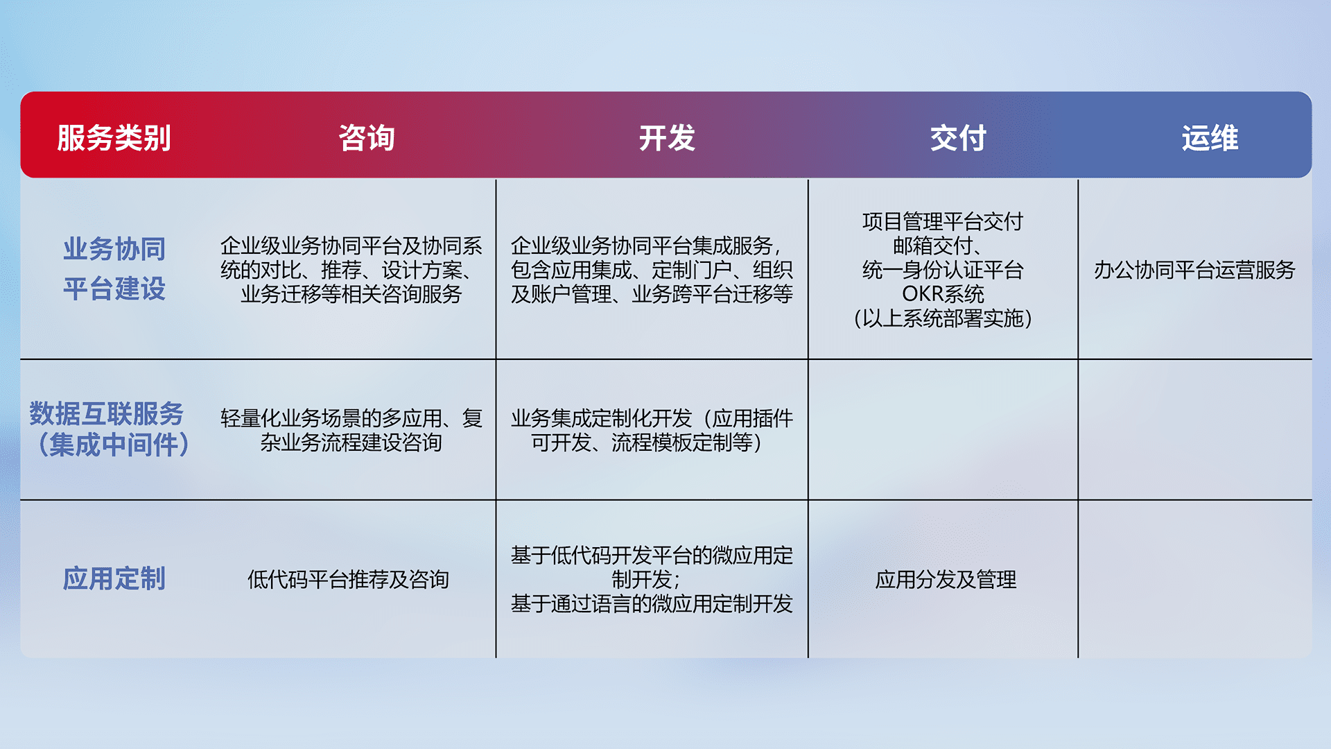 针对钉钉、、、企微、、、、IDaas等平台级产品提供产品的规划、、、、方案、、交付、、定制化开发等服务,,,实现如统一协同办公、、、智能客户服务、、混合会议管理、、智能数据查询、、、、等业务场景,,,,实现数字化转型。。